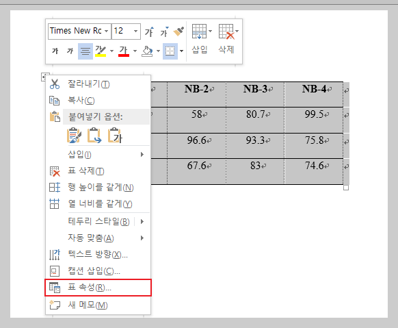 2. 우클릭을 하면 다음과 같은 화면이 나오는데, 여기에서 "표 속성" 을 선택한다.