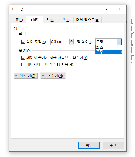 4. 높이 지정에 체크표시를 하면 아래 그림과 같이 행 높이(I)를선택할 수 있는데, 저걸 "고정"으로 선택한다. 그리고 높이 지정에서 사용자 마음대로 표의 높이를 조절해준다. (나는 0.5 cm 로 해줬다.)