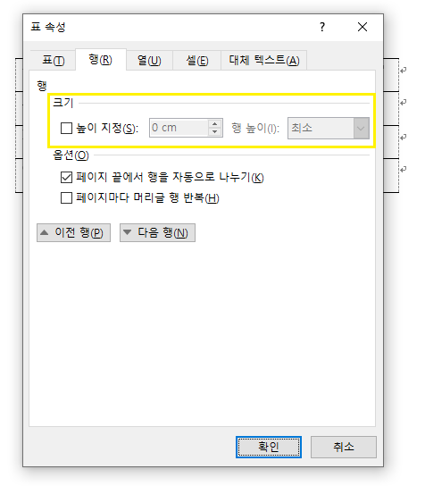 3. 표 속성에서 "행"에 들어가면 아래 그림과 같이 "크기"의 "높이 지정(S)" 네모 칸이 선택되지 않았을 것이다. 높이 지정에 체크표시를 해준다.