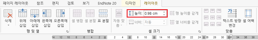 근데.. 표에서 행을 나눈 줄을 아무리 끌어보아도 행 (또는 셀)의 높이는 바뀌지 않고 그대로이고,